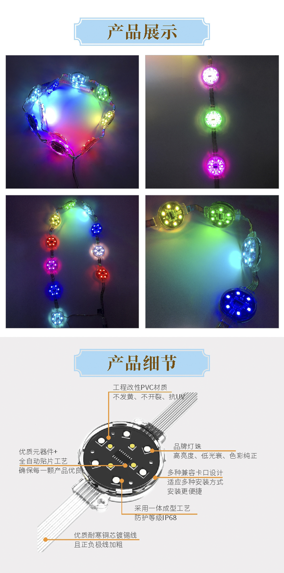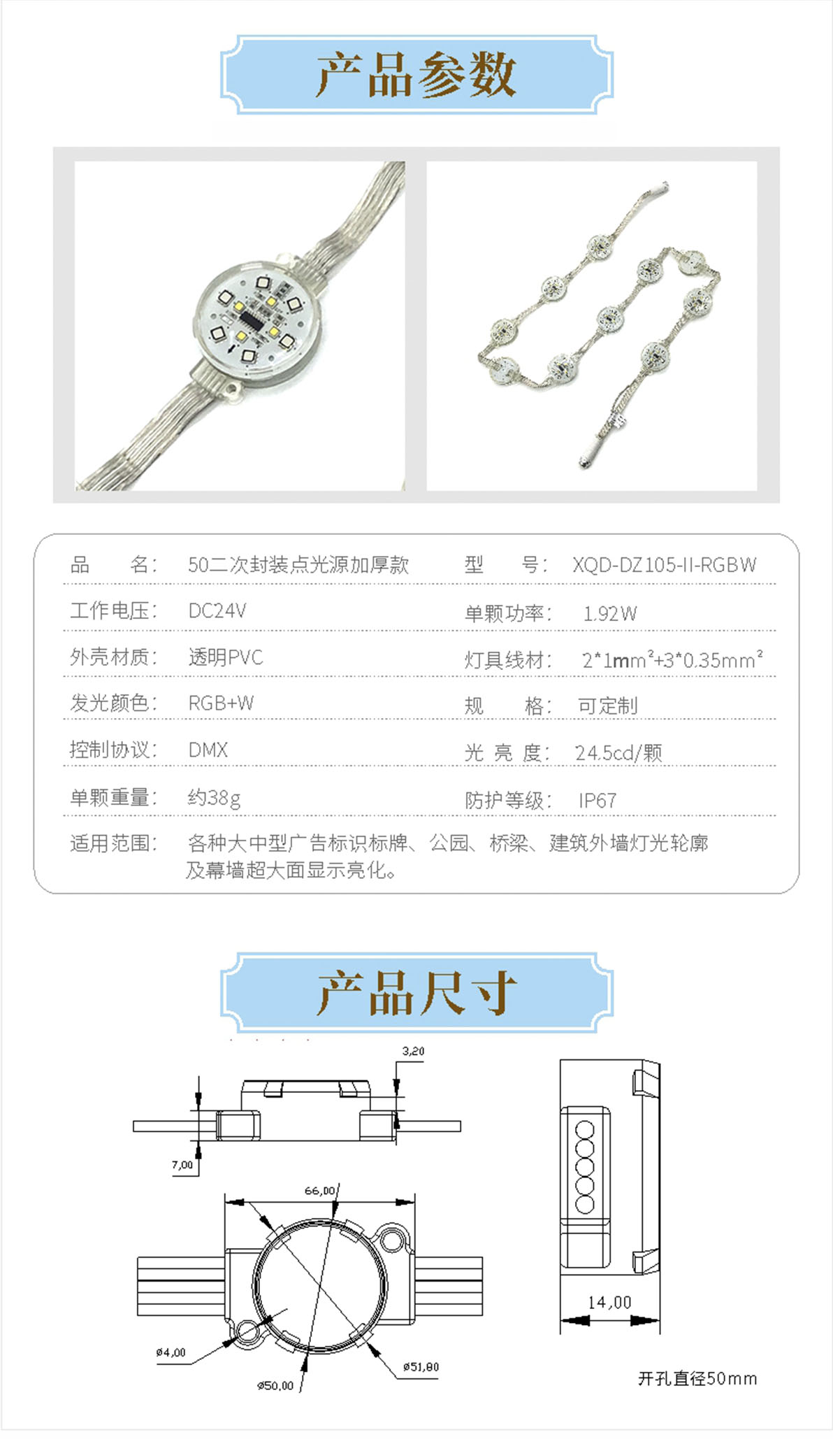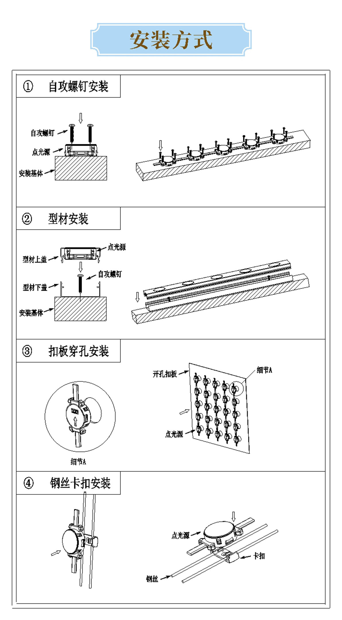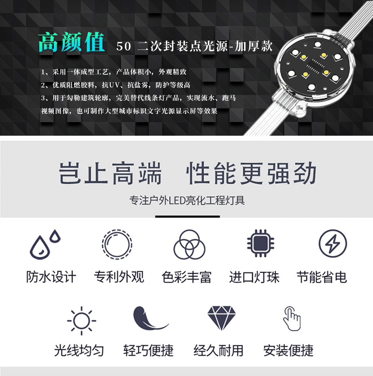 產(chǎn)品用途: 1.采用一體成型工藝,防護(hù)等級(jí)高; 2.加厚型優(yōu)質(zhì)阻然膠料,抗 UV、抗鹽霧、耐沖擊; 3.適應(yīng)多種安裝方式,安裝簡(jiǎn)單可靠; 4.優(yōu)質(zhì)進(jìn)口燈珠,亮度高、色彩純正,穩(wěn)定性好; 5.該產(chǎn)品為較大型的 LED 點(diǎn)光源,亮度較高;適用于大型建筑物的景 觀照明及大型橋梁輪廓勾勒。 安裝方式:1.卡鋁槽 2.裝鋼絲卡扣 3.打孔安裝 4.打螺絲固定