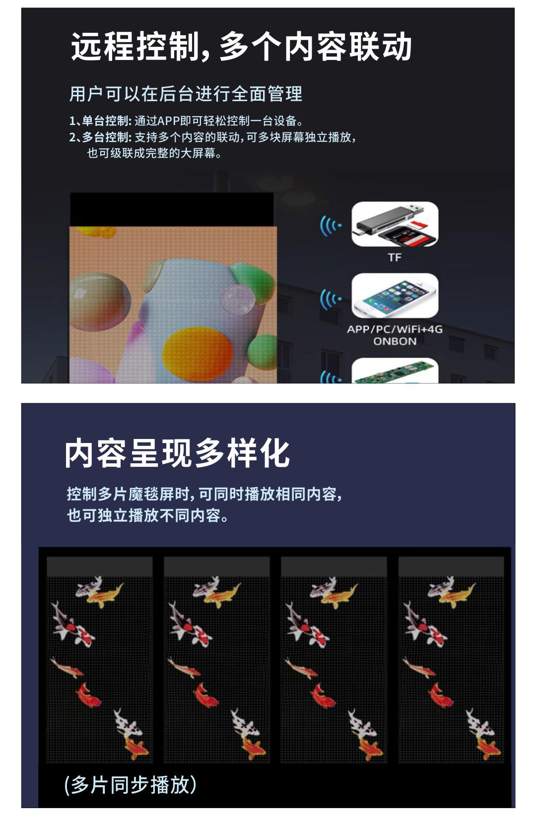 LED魔毯屏以LED燈珠為核心光源,具有高效節(jié)能、環(huán)保、壽命長等特點(diǎn)。通過數(shù)以千計的LED燈珠精細(xì)編織在柔軟的皮線中,形成了流光溢彩的燈串,能夠呈現(xiàn)出細(xì)膩、生動的色彩和圖像 應(yīng)用場景 室內(nèi)裝飾 LED魔毯屏在室內(nèi)裝飾中展現(xiàn)出極高的創(chuàng)意價值。它可以作為墻面、天花板或地面裝飾,呈現(xiàn)流動的光影、變幻的色彩或定制化的圖案與動畫,為空間注入夢幻氛圍。無論是現(xiàn)代簡約、奢華典雅還是前衛(wèi)時尚的風(fēng)格,魔毯屏都能完美適配。 舞臺燈光 在舞臺表演中,魔毯屏能夠通過動態(tài)光影效果為演員和場景提供全方位的支持。它可以營造浪漫、緊張或奇幻的氛圍,引導(dǎo)觀眾視線,增強(qiáng)表演的視覺沖擊力。此外,其靈活的安裝方式使其適用于各種舞臺布局。 商業(yè)空間 在購物中心、餐廳或展覽館等商業(yè)場所,魔毯屏通過營造獨(dú)特氛圍吸引顧客。例如,在購物中心的走廊或休息區(qū),它可以打造夢幻般的光影效果,提升顧客的購物體驗(yàn);在餐廳中,則可以營造出溫馨浪漫的用餐氛圍。 旅游景觀 在旅游景區(qū),魔毯屏能夠通過高亮度和高清晰度的動態(tài)展示,打造夢幻般的旅游體驗(yàn)。它不僅能夠呈現(xiàn)景區(qū)的文化內(nèi)涵,還能通過互動功能增強(qiáng)游客的參與感,提升景區(qū)的智慧化管理水平。