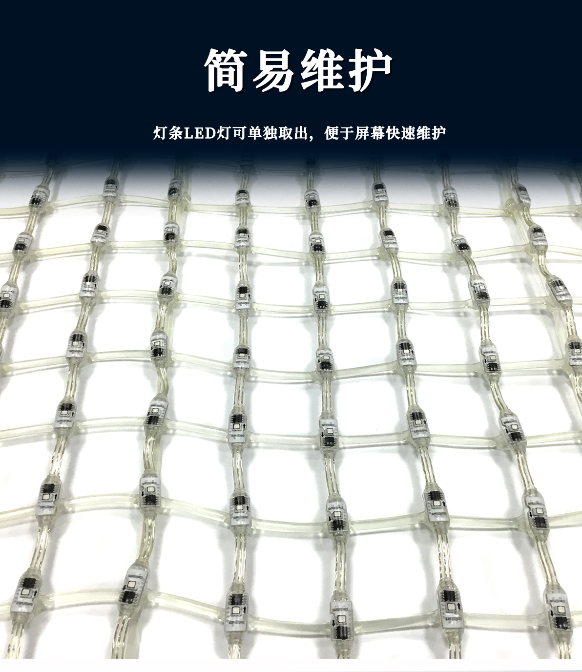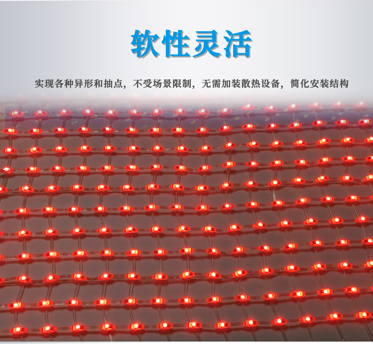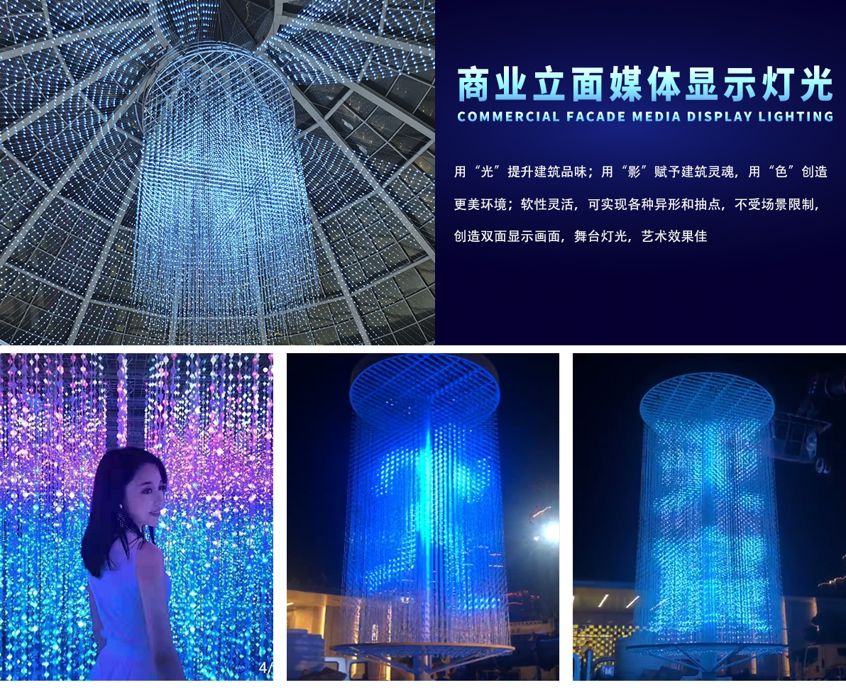 產(chǎn)品特點(diǎn): 1.采用一體成型工藝,防護(hù)等級(jí)高; 2.產(chǎn)品體積小,外觀精致,室內(nèi)外通用 3.優(yōu)質(zhì)阻然膠料,抗UV、抗鹽霧; 4.可適用于大中型廣告標(biāo)示標(biāo)牌、點(diǎn)陣屏、輪廓亮化。 產(chǎn)品簡(jiǎn)介: LED柔性網(wǎng)格屏,具有透明,靈活,輕便,易于安裝和維護(hù)的特點(diǎn),適合于多種安裝方式,比如彎曲,折疊,卷繞,懸掛等,做為一個(gè)整體透明LED網(wǎng)格屏.極具藝術(shù)性和創(chuàng)造性,可以自由組合成各種形狀。比常規(guī)網(wǎng)格屏通透度更高,柔性更好,適合各種異形裝飾。 技術(shù)要求說明: 1.掛墻安裝時(shí)可直接打鏍絲固定吊裝 2.可在各種特殊造型如山峰等,平鋪之上后完整還原造型形狀