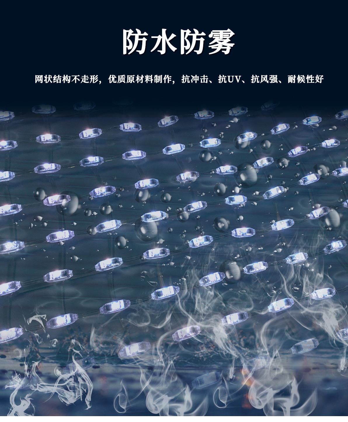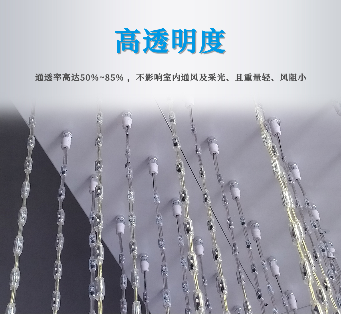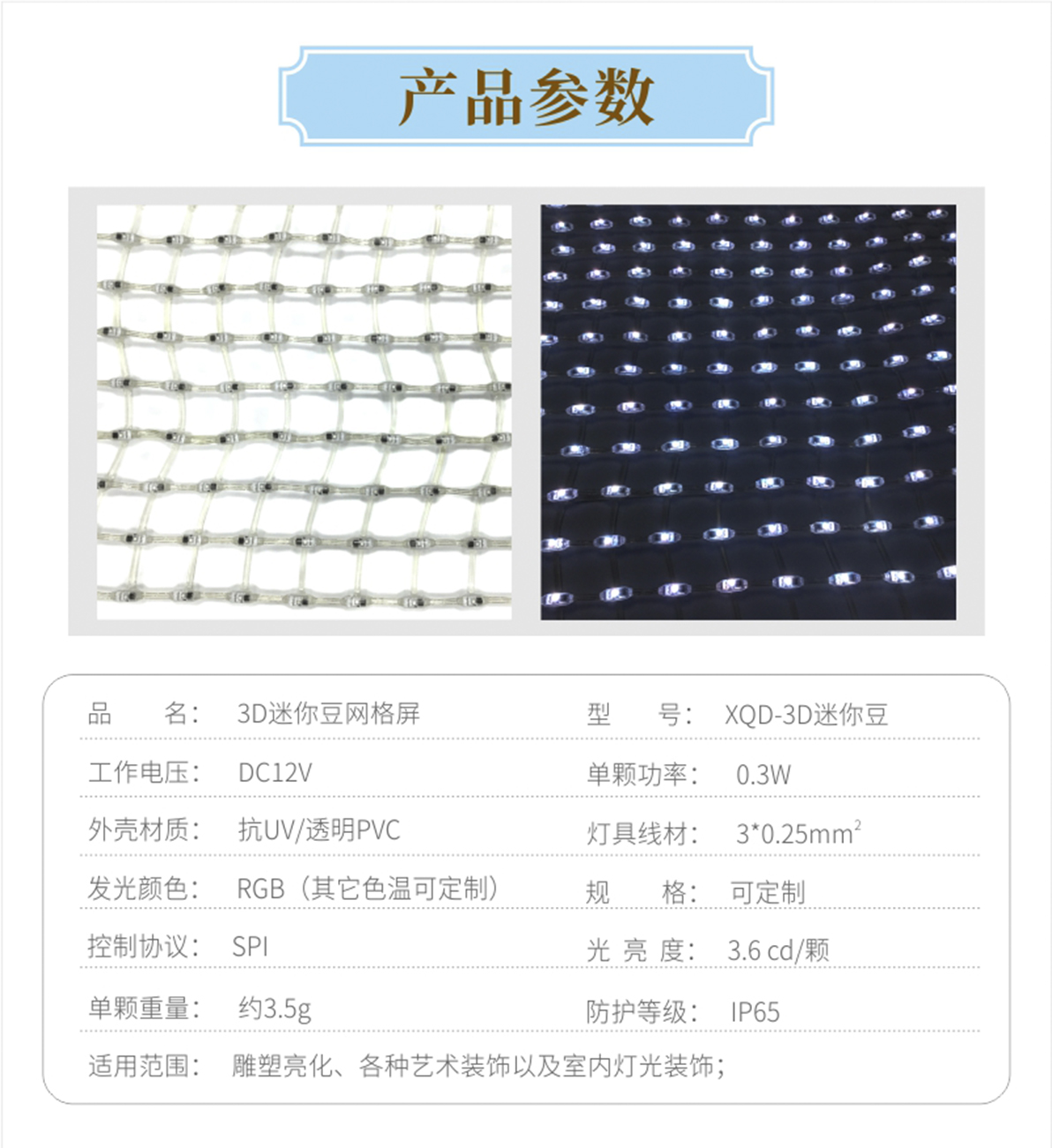 產(chǎn)品特點(diǎn): 1.采用一體成型工藝,防護(hù)等級(jí)高; 2.產(chǎn)品體積小,外觀精致,室內(nèi)外通用 3.優(yōu)質(zhì)阻然膠料,抗UV、抗鹽霧; 4.可適用于大中型廣告標(biāo)示標(biāo)牌、點(diǎn)陣屏、輪廓亮化。 產(chǎn)品簡(jiǎn)介: LED柔性網(wǎng)格屏,具有透明,靈活,輕便,易于安裝和維護(hù)的特點(diǎn),適合于多種安裝方式,比如彎曲,折疊,卷繞,懸掛等,做為一個(gè)整體透明LED網(wǎng)格屏.極具藝術(shù)性和創(chuàng)造性,可以自由組合成各種形狀。比常規(guī)網(wǎng)格屏通透度更高,柔性更好,適合各種異形裝飾。 技術(shù)要求說明: 1.掛墻安裝時(shí)可直接打鏍絲固定吊裝 2.可在各種特殊造型如山峰等,平鋪之上后完整還原造型形狀